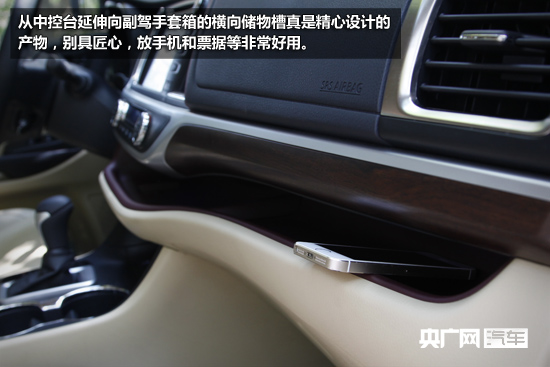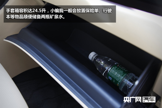 先說(shuō)儲(chǔ)物空間,從中控臺(tái)延伸向副駕手套箱的橫向儲(chǔ)物槽真是精心設(shè)計(jì)的產(chǎn)物,別具匠心,放手機(jī)和票據(jù)等非常好用。手套箱容積達(dá)24.5升,小編我一般會(huì)放置保險(xiǎn)單、行駛本等物品順便儲(chǔ)備兩瓶礦泉水。