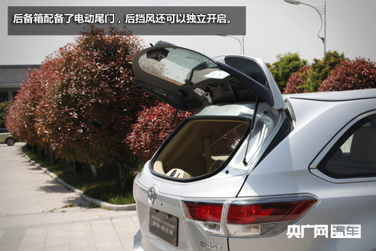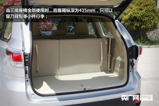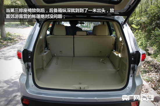 后備箱方面,當(dāng)三排座椅全部使用時(shí),后備箱縱深為435mm,只可以容乃背包等小件行李;但是當(dāng)?shù)谌抛畏诺购螅髠湎淇v深就到到了一米出頭,放置郊游露營(yíng)的帳篷絕對(duì)沒(méi)問(wèn)題;而當(dāng)后兩排座椅全部放倒后,后備箱變成了一張雙人床,兩米零九的縱深可以用于搬家或帶上自行車出去high!這也是漢蘭達(dá)作為一款SUV對(duì)比相同底盤的轎車凱美瑞最大的優(yōu)勢(shì)。后備箱配備了電動(dòng)尾門,后擋風(fēng)還可以獨(dú)立開啟。