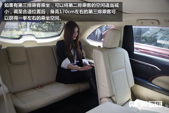 乘坐空間方面,如果將第二排座椅調(diào)至最大空間,身高170mm左右的乘客可以獲得腿部30cm、頭部15cm左右的舒適乘坐空間;如果有第三排乘客乘坐,可以將第二排乘客的空間適當(dāng)減小,調(diào)至合適位置后,身高170cm左右的第三排乘客可以獲得一拳左右的乘坐空間,這樣的空間在同級(jí)別車型中已經(jīng)算相當(dāng)不錯(cuò)了,至少在長(zhǎng)途旅行過(guò)程中不會(huì)過(guò)于難受。