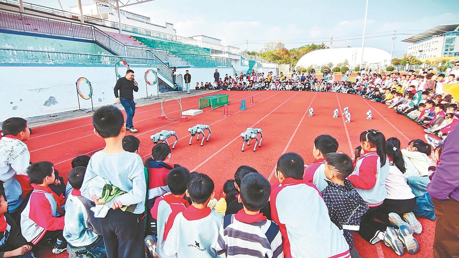 10月28日,在黃山市黟縣碧陽小學(xué)操場上,小朋友在和機(jī)器狗、機(jī)器人快樂互動。