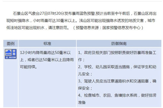 人民網(wǎng)北京7月27日電 石景山區(qū)氣象臺27日07時20分發(fā)布暴雨藍(lán)色預(yù)警,預(yù)計當(dāng)前至中午前后,石景山區(qū)將出現(xiàn)短時強降水,小時雨量可達30毫米以上。淺山區(qū)可能出現(xiàn)強降水誘發(fā)的地質(zhì)災(zāi)害,城市低洼地區(qū)可能出現(xiàn)積水,請注意防范。(預(yù)警信息來源:國家預(yù)警信息發(fā)布中心)