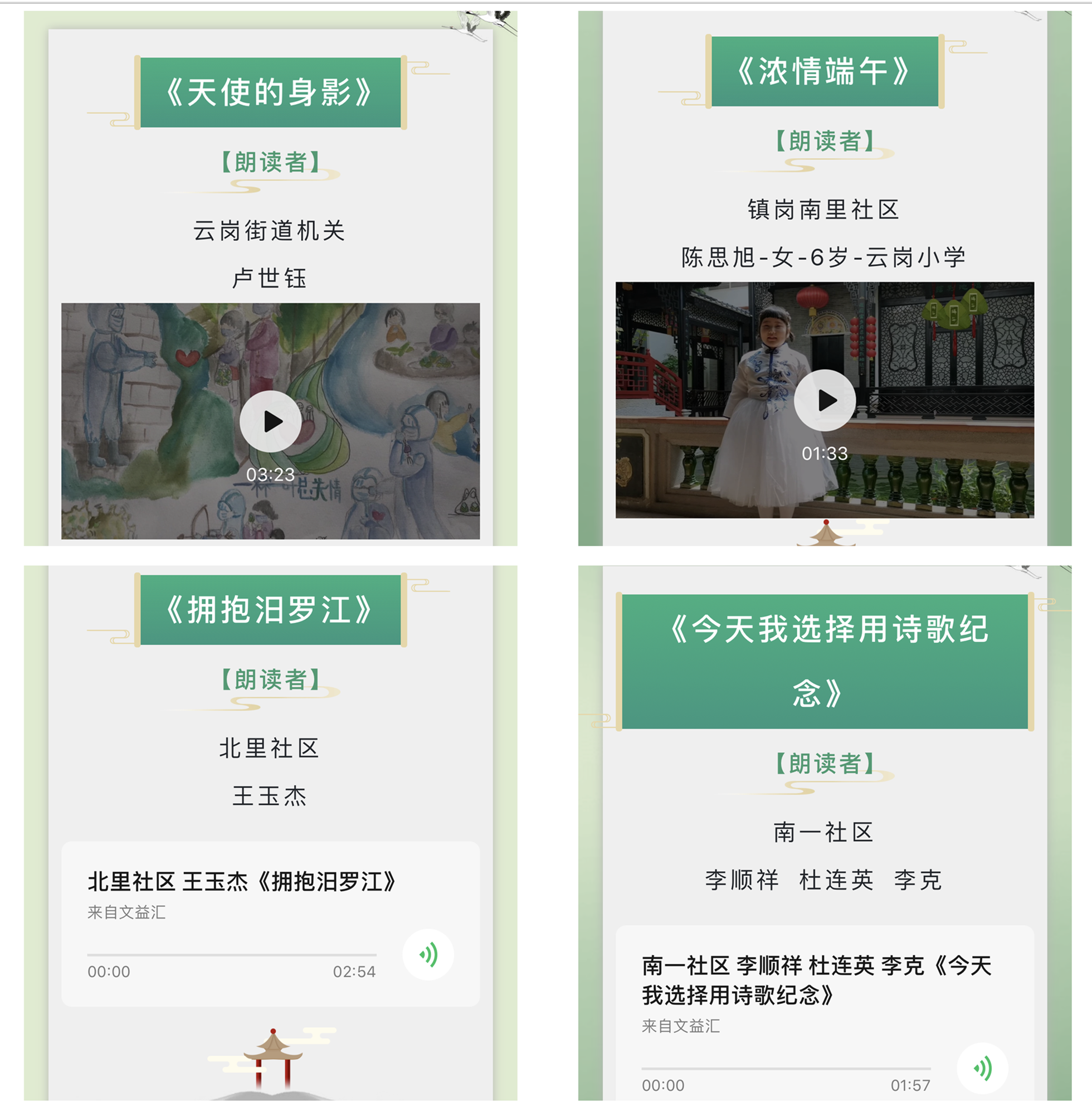 “往年端午節(jié),都是在線下以各種形式舉辦活動,弘揚家國情懷、感受中華優(yōu)秀傳統(tǒng)文化、寄托美好愿望。疫情期間,為防止人流密集、保證居民身體健康,目前還不能開展聚集性活動,通過‘互聯(lián)網(wǎng)+文化’的形式,讓轄區(qū)居民朋友們匯聚‘云端’,在感受傳統(tǒng)文化魅力的同時,學習防疫知識,用聲音、用畫筆為抗疫加油鼓勁!”云崗街道辦事處社區(qū)建設辦公室副主任李明輝說。