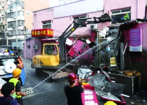 東城城管龍?zhí)秷?zhí)法隊(duì)副隊(duì)長(zhǎng)趙巖說,這片違建建于上世紀(jì)80年代,距離旁邊的鐵路線只有40米。隨著大型機(jī)器的鐵臂下去,酥脆的墻面迅速倒下,露出房頂內(nèi)部破舊的電線!坝械姆孔臃宽斁褪撬芰吓菽褰ǔ傻,加上私拉電線,具有非常大的安全隱患!