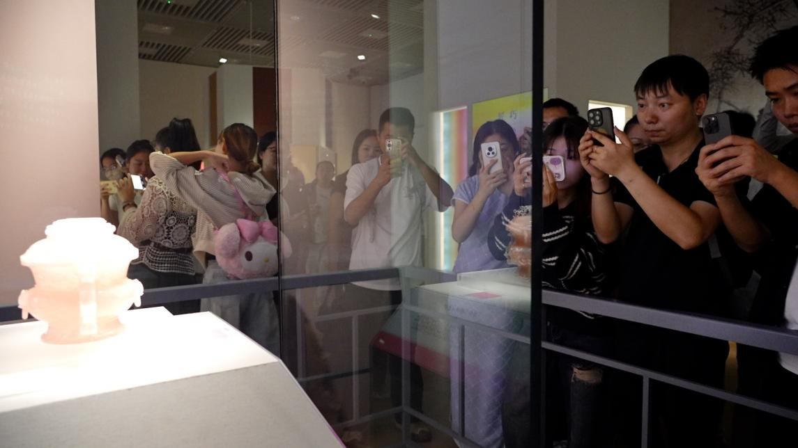 觀眾在南京博物院圍觀“小粉爐”原型——清乾隆芙蓉石蟠螭耳蓋爐(記者黃成 攝)