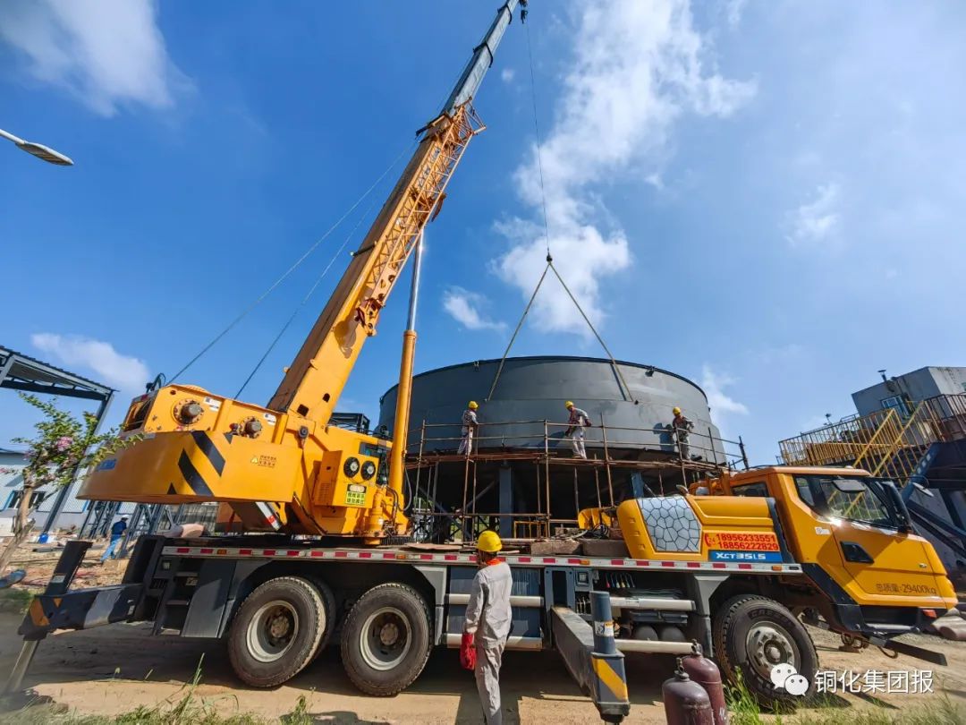 項目完工投用后,每年可處理選礦廢水247.5萬立方米、酸性廢水1000萬立方米,去除COD1485噸、硫化物146.03噸、重金屬錳208噸,在保障原生產線正常運行的同時,顯著降低相關污染物排放,實現(xiàn)外排水水質穩(wěn)定達標,有效保護當?shù)厮h(huán)境,環(huán)境效益和社會效益顯著。上圖為吊裝作業(yè)現(xiàn)場。