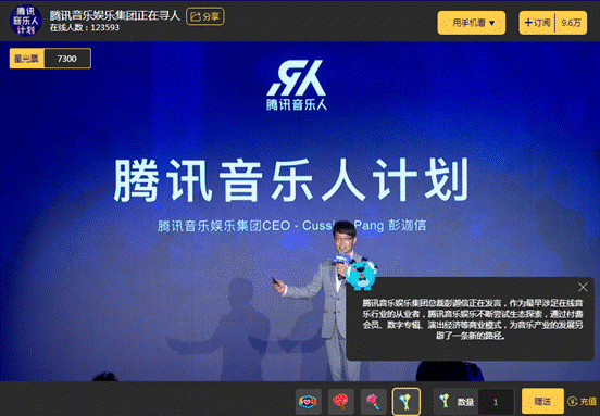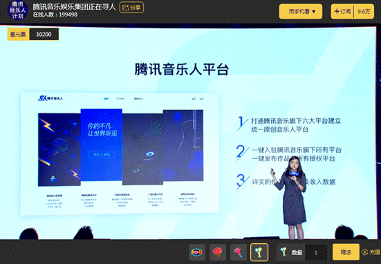 隨后騰訊音樂娛樂集團(tuán)戰(zhàn)略發(fā)展部總經(jīng)理羅羿對此進(jìn)行了補(bǔ)充,并通過產(chǎn)品“騰訊音樂人平臺(tái)”的介紹詳細(xì)解釋如何通過打通六大平臺(tái)為音樂人提供支持。