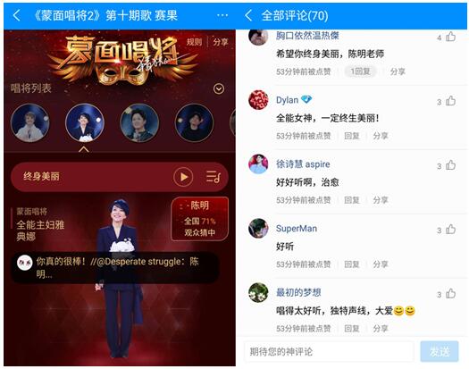 作為史上名字最長的唱將,港樂女伶“去游樂場散步才是正經(jīng)事”陳慧嫻的成功揭面也在蒙面舞臺上定格經(jīng)典,一曲《你怎么舍得我難過》在QQ音樂、酷狗音樂、酷我音樂的節(jié)目人氣專榜均成功闖入前三,并在酷狗音樂穩(wěn)坐TOP 1!半p陳”的到來,掀起了網(wǎng)友們對當年樂壇黃金時代的集體感懷,并通過QQ音樂貢獻大量彈幕,表示“天后就是不同”。