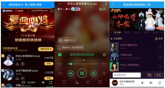 蟬聯(lián)9周收視冠軍,上周日晚播出的《蒙面唱將猜猜猜》第二季第10期節(jié)目再次洶涌來襲。除了有潘粵明為夢踢館、蔣敦豪挑戰(zhàn)自我,陳慧嫻、陳明兩位經(jīng)典女伶的現(xiàn)身更是掀起一波回憶殺。作為節(jié)目的專享音頻合作伙伴,騰訊音樂娛樂集團三大平臺QQ音樂、酷狗音樂、酷我音樂不僅通過高品質(zhì)零時差專輯同步見證驚喜,更帶來特色化的榜單、互動,與廣大網(wǎng)友共同追憶了音樂的黃金時代。