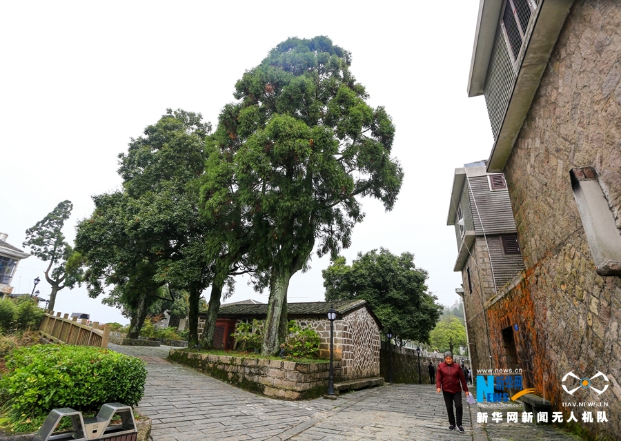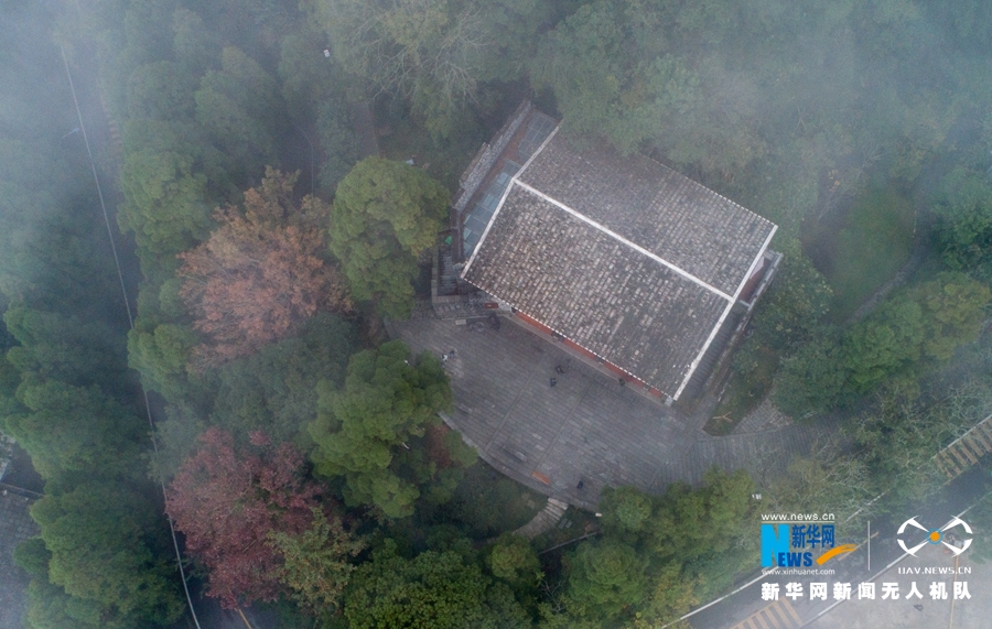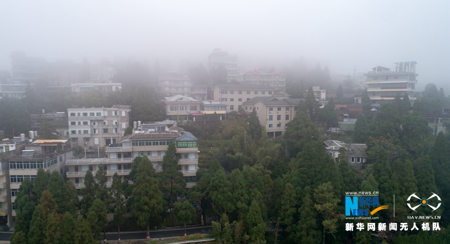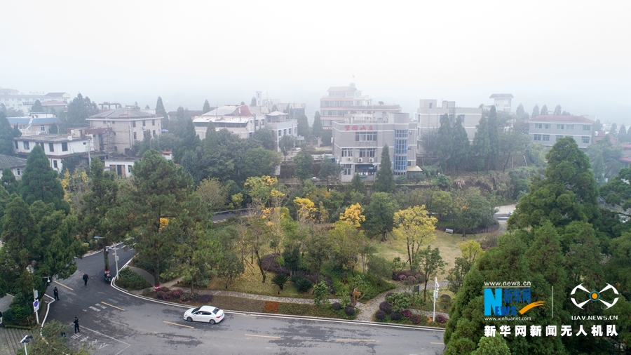 這是在鼓嶺柳杉王公園一帶拍攝到的樹木和民居,遠處濃霧籠罩(11月6日無人機拍攝)。新華網(wǎng) 肖和勇 攝