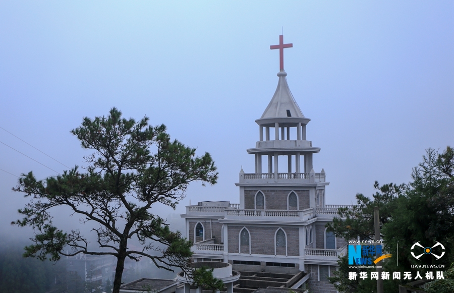 這是大霧中的鼓嶺基督教堂一隅(11月6日攝)。新華網(wǎng) 肖和勇 攝