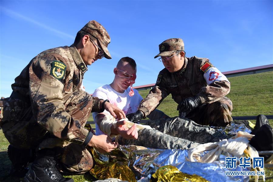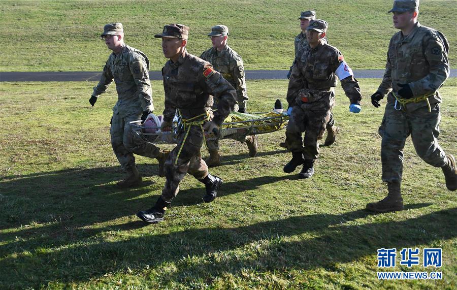11月18日,在美國俄勒岡州錫賽德的國民警衛(wèi)隊拉里葉軍營,中美兩軍參演人員一同救治“傷員”。中美兩軍人道主義救援減災(zāi)聯(lián)合實(shí)兵演練當(dāng)日進(jìn)入第三天。此次聯(lián)合演練中美兩軍共派出200余人參加。新華社記者殷博古攝 -