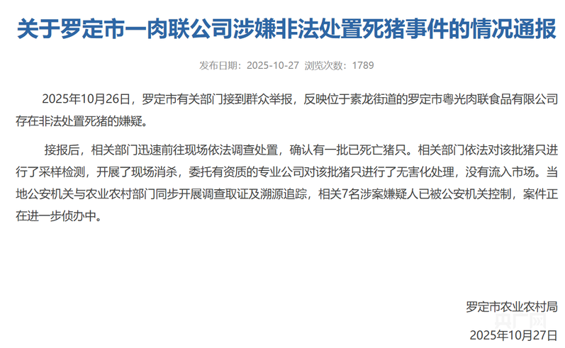 央廣網(wǎng)云浮10月28日消息(記者鄭少純)據(jù)云浮市羅定市農(nóng)業(yè)農(nóng)村局10月27日發(fā)布的通報,2025年10月26日,羅定市有關(guān)部門接到群眾舉報,反映位于素龍街道的羅定市粵光肉聯(lián)食品有限公司存在非法處置死豬的嫌疑。