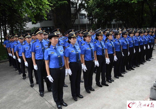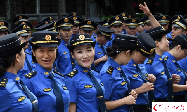 大洋網(wǎng)訊 10月1日起,廣州市城管執(zhí)法將換上全國統(tǒng)一服裝。9月29日,市城管委舉行換裝儀式,全體人員換上藍(lán)色系新制服。