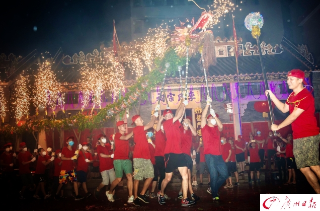 中秋當晚7時許,白云區(qū)均禾街清湖村李氏宗祠前,村民們在祠堂前舞火龍,慶祝中秋佳節(jié)。廣報全媒體記者陳憂子攝