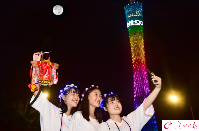 一群來自河南的游客正在明月下和廣州塔合影,她們說“廣州太美啦!”廣報全媒體記者王燕攝