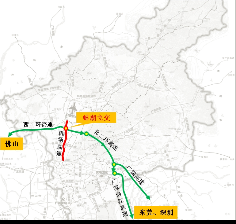 往佛山方向的車輛:機(jī)場高速(蚌湖立交)—西二環(huán)高速—佛山一環(huán)高速—佛山方向