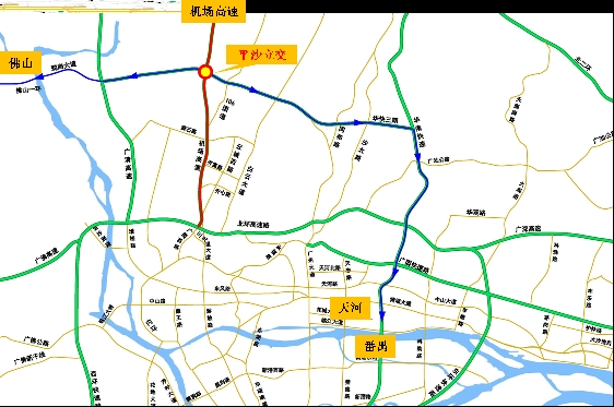 往天河、番禺方向的車輛:機(jī)場高速(平沙立交)—華快三期—華南快速—天河、番禺方向。