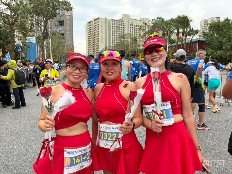 終點儀式感拉滿:距離沖線拱門1km處的音樂隧道,工作人員全程播放動感音樂并向跑者贈送玫瑰花,提前烘托沖刺氛圍;女性跑者沖過終點后,更能收到志愿者遞上的專屬玫瑰,感受海陵島的溫柔禮遇。