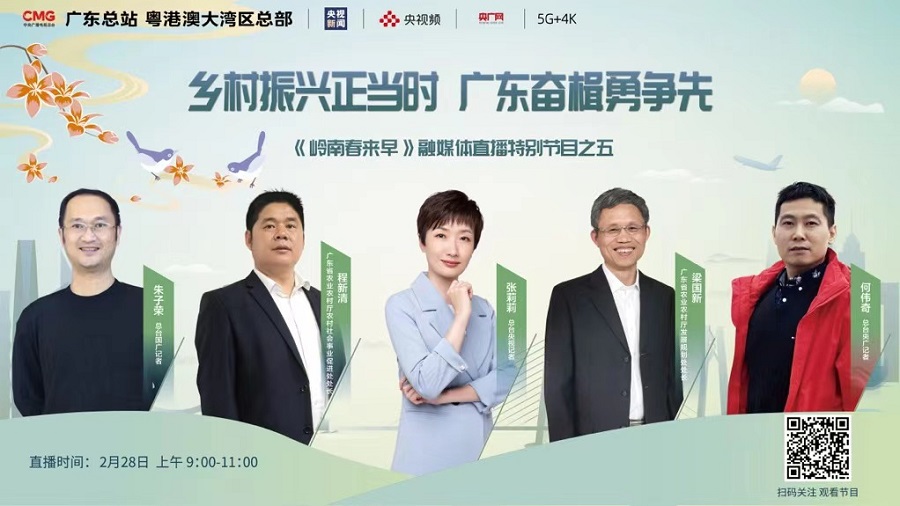 2月26日起至2月28日,中央廣播電視總臺廣東總站暨粵港澳大灣區(qū)總部推出六期融媒體直播特別節(jié)目《嶺南春來早》,通過央視新聞、央廣網(wǎng)、央視頻等總臺新媒體平臺,展現(xiàn)廣東在開局之年主動作為的奮戰(zhàn)場面。