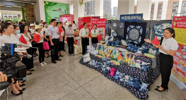 采訪團(tuán)在“微笑染坊跟黨走”主題展位前聽(tīng)介紹 (央廣網(wǎng)發(fā) 唐澤龍攝)