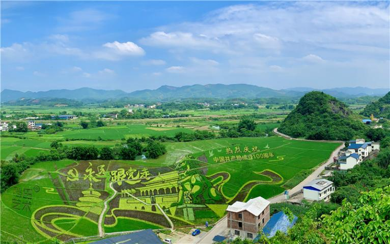 這是馬安村慶祝中國(guó)共產(chǎn)黨成立100周年的獻(xiàn)禮之作,以大地為畫(huà)布,用水稻為顏料,在以綠色為主基調(diào)的田野中,將褐、黃、綠不同顏色的水稻,拼湊成建黨100周年標(biāo)識(shí)、北京天安門(mén)圖案、和平鴿等不同形態(tài)的圖案,勾勒出一幅唯美動(dòng)人的“田園山水畫(huà)”,成為“美麗鄉(xiāng)村”的一道特色風(fēng)景。