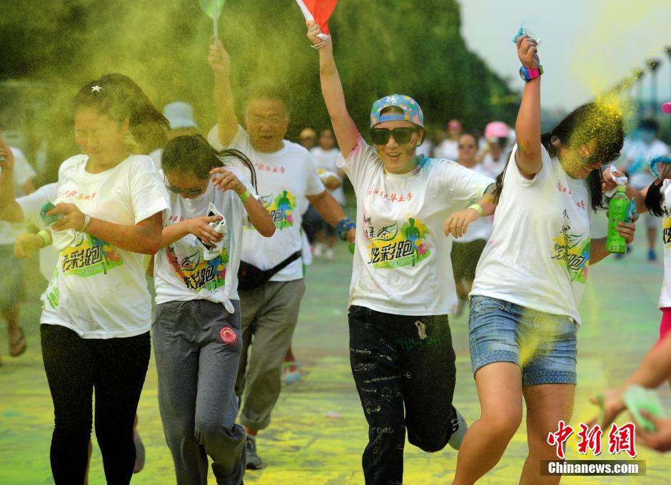 央廣網(wǎng)河南分網(wǎng)消息 據(jù)中新網(wǎng)報道:7月13日,上千武漢市民齊聚武漢漢口江灘參加5公里炫彩跑運(yùn)動,他們一路邊跑邊走邊嬉戲,時時開懷大笑。跑步距離為5公里,每公里設(shè)置一個彩色站,當(dāng)選手跑步或步行至彩色站時,由工作人員及志愿者向參與者拋灑彩色粉末。炫彩跑是一項娛樂項目,它融合了跑步和色彩,與傳統(tǒng)跑步競速相比,更強(qiáng)調(diào)“參與、娛樂和色彩”的重要性。(中新社發(fā) 張暢 攝)