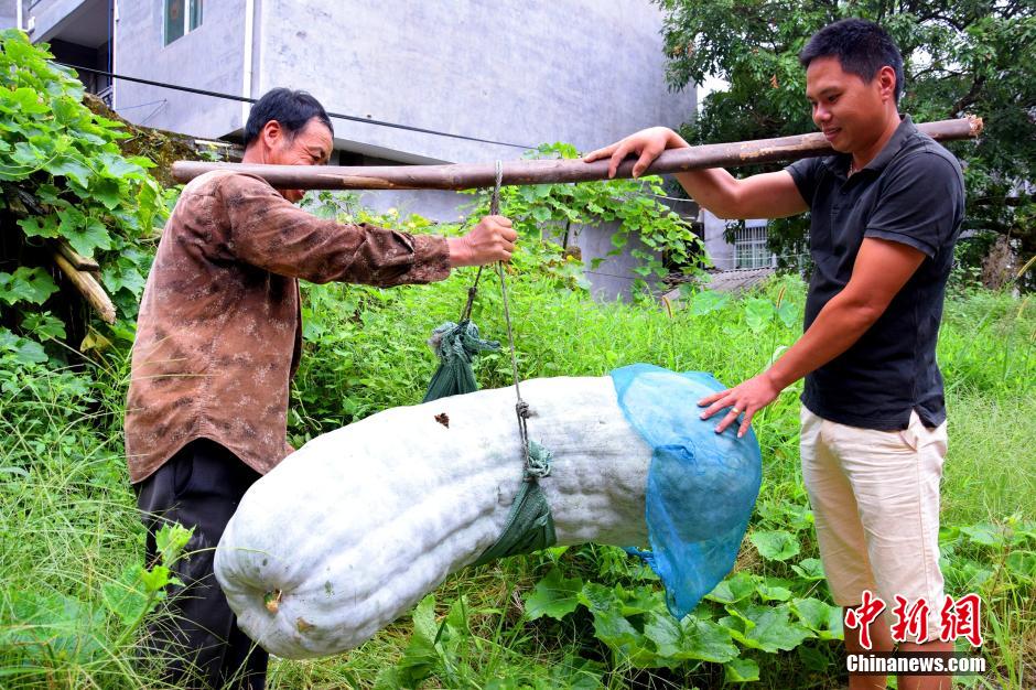 圖為村民合力抬冬瓜,扁擔(dān)都被壓彎。 馮愷暉 攝