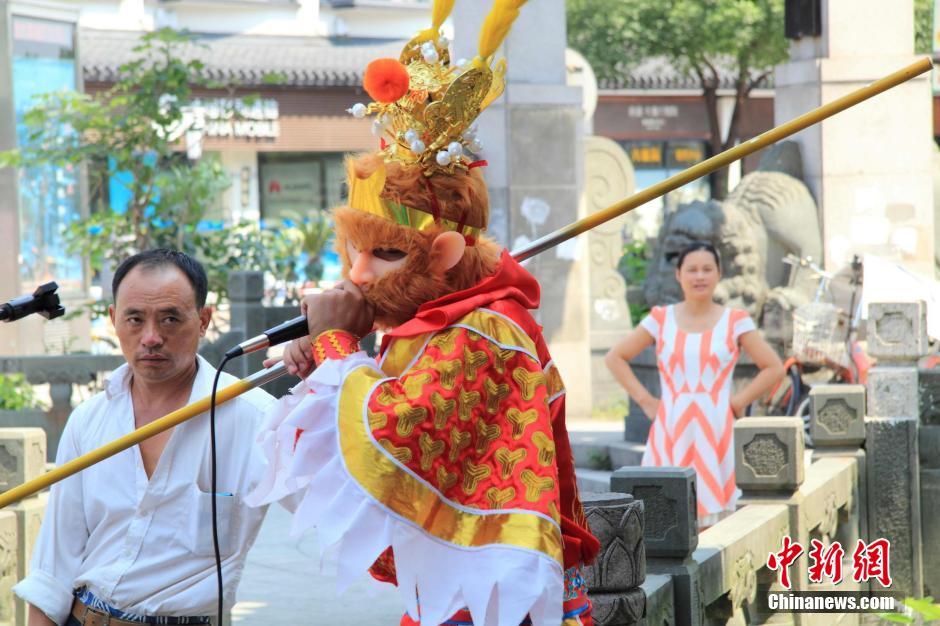 2014年9月17日中午,一位打扮成“齊天大圣”孫悟空的街頭藝人在浙江紹興市區(qū)街頭賣唱,吸引不少過路人的目光。(李瑞昌 攝) 圖片來源:CNSPHOTO