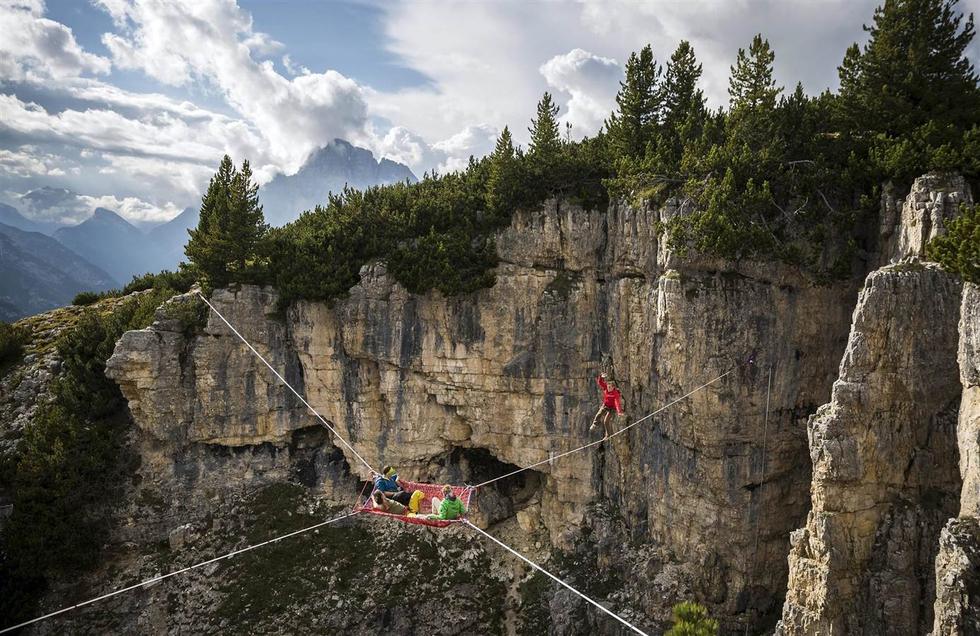 據(jù)NBC,意大利境內(nèi)的阿爾卑斯山脈挺拔峻峭,擁有眾多隆起的山峰和巨石,是登山愛好者心中的理想勝地。2014年的國(guó)際高空繩索活動(dòng)就在意大利北部的山谷中舉行,一組極限運(yùn)動(dòng)愛好者再次挑戰(zhàn)新創(chuàng)意,不僅將繩索架在山頭或巨石之間,還在繩索上面鋪起了吊床,一邊享受廣闊空間的蕩氣回腸,一邊俯瞰峽谷的驚心動(dòng)魄,勇氣和心態(tài)著實(shí)令人佩服。