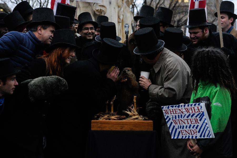 央廣網(wǎng)河南分網(wǎng)消息 2月2日,在美國首都華盛頓,人們圍繞在該地區(qū)的土撥鼠波托馬克·菲爾旁,“聆聽”它的預(yù)測。波托馬克·菲爾是一個(gè)土撥鼠模型。每年的2月2日是北美地區(qū)的傳統(tǒng)節(jié)日“土拔鼠日”。根據(jù)傳說,如果土撥鼠從洞穴里爬出后能看到自己的影子,當(dāng)?shù)厝司蜁?huì)相信冬天至少還有六周才會(huì)結(jié)束。根據(jù)土撥鼠日官方網(wǎng)站發(fā)布的消息,美國最著名的“天氣預(yù)測專家”、來自賓夕法尼亞州的土撥鼠“菲爾”2日晨出洞后看到了自己的影子,預(yù)測美國至少還要忍受六周的寒冷冬日。新華社記者鮑丹丹攝
