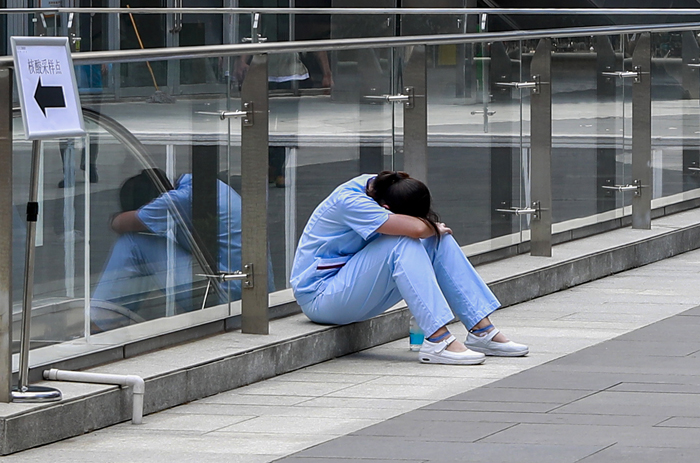 圖為:核酸采樣點旁,一名輪換下來的醫(yī)護人員正在休息 央廣網發(fā) 通訊員供圖