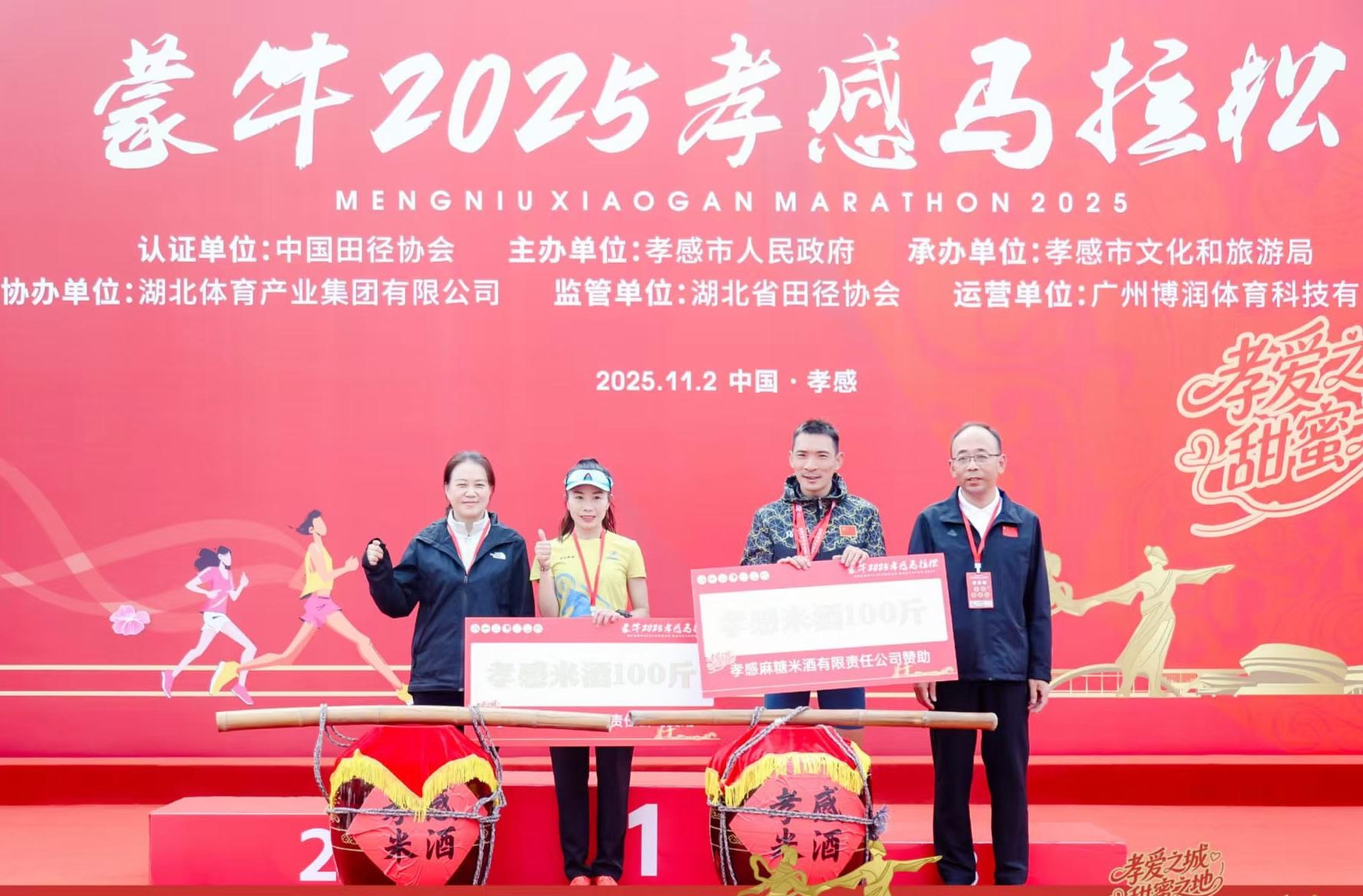 2025孝感馬拉松男、女冠軍收獲100斤孝感米酒(央廣網發(fā) 孝感市委宣傳部 供圖)