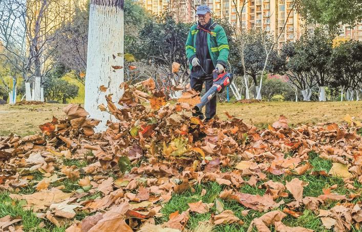 12月14日上午,武漢市關山公園內,園林工人忙著清理地面落葉,“落葉不掃”觀賞期接近尾聲!奥淙~不掃”是武漢精心管理的城市美學實踐,為市民提供秋景觀賞空間。隨著落葉開始腐敗,清理殘葉是消除安全隱患、保障園林環(huán)境整潔、促進園林生態(tài)健康的重要工作。