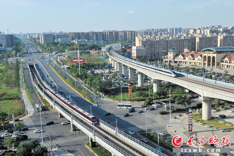 長(zhǎng)沙已成為軌道交通產(chǎn)業(yè)集聚區(qū),近年來(lái)軌道交通在城市交通中占比越來(lái)越大。圖為長(zhǎng)沙中信新城站附近,長(zhǎng)沙地鐵1號(hào)線(xiàn)列車(chē)(左)和長(zhǎng)株潭城鐵列車(chē)并駕齊驅(qū)。 長(zhǎng)沙晚報(bào)記者鄒麟攝