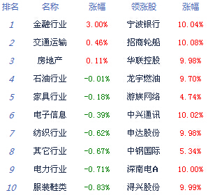 從盤面上看,銀行、券商、機(jī)場航運(yùn)、港口航運(yùn)漲幅居前,環(huán)保、農(nóng)業(yè)、大飛機(jī)、新材料等跌幅居前。