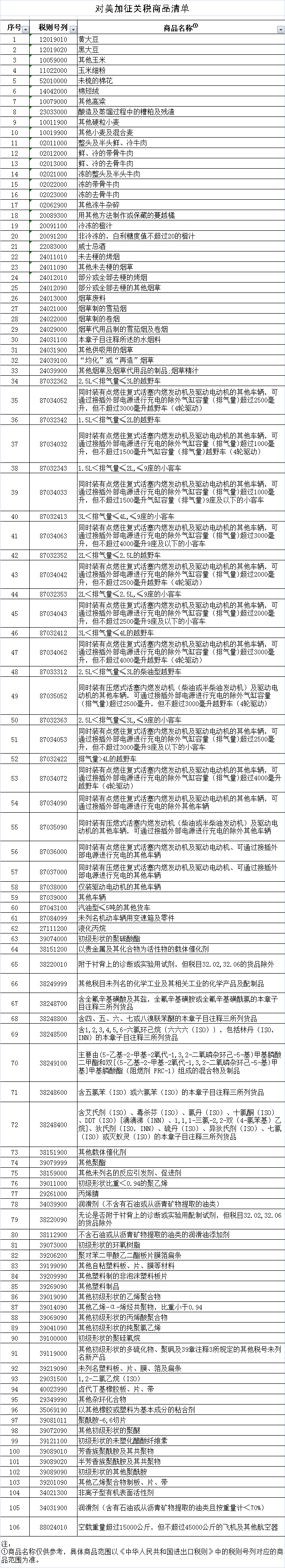 根據(jù)《中華人民共和國對外貿(mào)易法》和《中華人民共和國進出口關(guān)稅條例》相關(guān)規(guī)定,經(jīng)國務(wù)院批準(zhǔn),國務(wù)院關(guān)稅稅則委員會決定對原產(chǎn)于美國的大豆、汽車、化工品等14類106項商品加征25%的關(guān)稅。實施日期將視美國政府對我商品加征關(guān)稅實施情況,由國務(wù)院關(guān)稅稅則委員會另行公布。