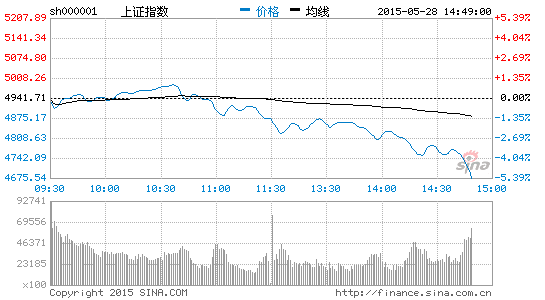 央廣網(wǎng)北京5月28日消息 據(jù)經(jīng)濟(jì)之聲《交易實(shí)況》報(bào)道,早盤,滬指低開高走,再創(chuàng)7年新高,最高達(dá)4986.50點(diǎn),逼近5000點(diǎn)關(guān)口,十點(diǎn)半左右滬指高位跳水,權(quán)重股走低,題材股沖高回落;午后開盤滬指再度跳水,截止收盤報(bào)4620.27點(diǎn),跌321.45點(diǎn),跌幅6.50%。兩市成交24206億元,其中滬市成交12479億元,量比1.23,深市成交11727億元,量比1.38。兩市共有超過500只個(gè)股跌停,超過2000只個(gè)股收跌。