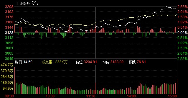 央廣網(wǎng)財經(jīng)北京2月3日消息 據(jù)經(jīng)濟之聲《交易實況》報道,兩市沖高回落。下午繼續(xù)走高。金融股暴漲,創(chuàng)業(yè)板迎來新紀元。截至收盤,滬指報3204.91點,上漲76.61點,漲幅2.45%,成交2834億元;深成指報11209.1點,上漲246.05點,漲幅2.24%,成交2339億元;創(chuàng)業(yè)板指報1750.91點,上漲54.08點,漲幅3.19%,成交540.5億元。