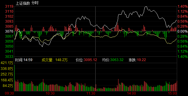 央廣網(wǎng)財(cái)經(jīng)北京2月9日消息 據(jù)經(jīng)濟(jì)之聲《交易實(shí)況》報(bào)道,兩市開盤漲跌互現(xiàn),在券商、保險(xiǎn)等板塊的帶動(dòng)下,滬指有所回升,午后兩點(diǎn)十四分左右出現(xiàn)高點(diǎn)3118點(diǎn),隨后震蕩小幅下滑。截至收盤,滬指報(bào)3095.12點(diǎn),上漲19.22點(diǎn),漲幅0.62%,成交2407億元;深成指報(bào)10868.1點(diǎn),上漲77.04點(diǎn),漲幅0.71%,成交1954億元;創(chuàng)業(yè)板指報(bào)1708.85點(diǎn),下跌22.12點(diǎn),跌幅1.28%,成交415.6億元。