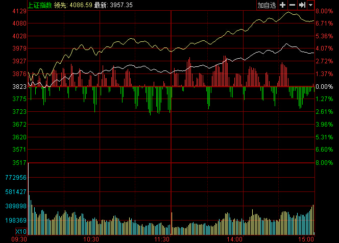 截至收盤,滬指報3957.35點,漲134.17點,漲幅3.51%,深成指報13004.96點,漲647.35點,漲幅5.24%,創(chuàng)業(yè)板報2783.32點,漲156.24點,漲幅5.95%。