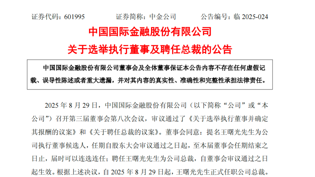 “70后”投行老將王曙光履新中金公司總裁