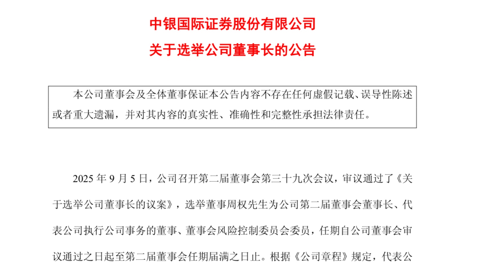 中銀證券近日發(fā)布董事長(zhǎng)變更公告,選舉周權(quán)為董事長(zhǎng)。
