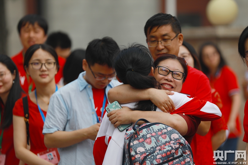 人大附中考生在進(jìn)考場(chǎng)之前和老師擁抱(央廣網(wǎng)記者 張凱航 攝)