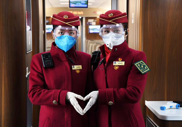 1月31日,京津城際列車(chē)乘務(wù)員做好自身安全防護(hù)兩人做了一個(gè)“心”的手勢(shì)象征著“加油”(北京鐵路供圖 楊寶森 攝)