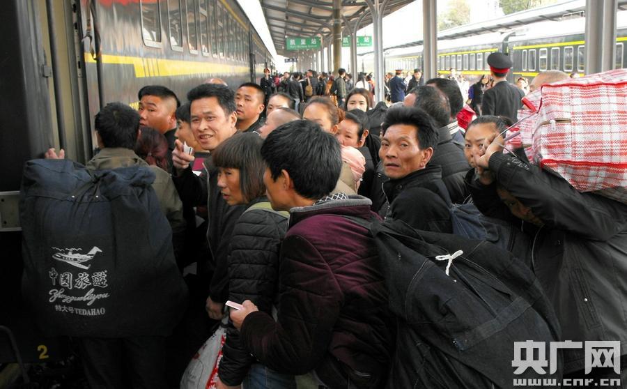 2月22日,凱里火車站外出務(wù)工旅客在排隊(duì)上車中。(央廣網(wǎng)發(fā) 姜澤鵬攝) 央廣網(wǎng)黔東南苗族侗族自治州2月22日消息(記者陳屹 通訊員姜澤鵬)2月22日,春運(yùn)結(jié)束后第一天,成都鐵路局凱里火車站迎來(lái)務(wù)工流和學(xué)生流高峰。 客流方向主要往上海、北京、廣州、重慶、福建等。春運(yùn)結(jié)束,服務(wù)不減,貴州鐵路嚴(yán)把實(shí)名制驗(yàn)證驗(yàn)票和“三品”檢查關(guān)口,對(duì)進(jìn)站口、檢票口、站臺(tái)、天橋、地道、電梯、樓梯等重點(diǎn)部位加強(qiáng)盯控,做好客流引導(dǎo)和旅客服務(wù)工作。 -