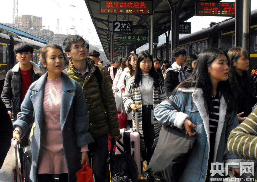 2月22日,凱里火車站的學(xué)生客流。(央廣網(wǎng)發(fā) 姜澤鵬攝)