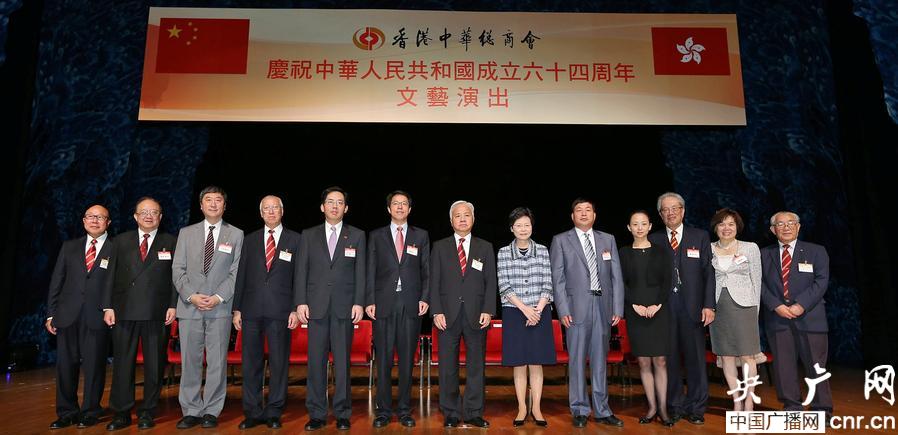 中央政府駐港聯(lián)絡(luò)辦公室張曉明主任(左六)、香港特別行政區(qū)政務(wù)司林鄭月娥司長(右六)、外交部駐港特派員公署洪小勇署理特派員(左五)及解放軍駐港部隊(duì)海軍參謀長方玉信大校(右五)聯(lián)同中總楊釗會(huì)長(右七)及其他中總首長嘉賓合照(央廣網(wǎng)發(fā) 圖片由香港中華總商會(huì)提供)