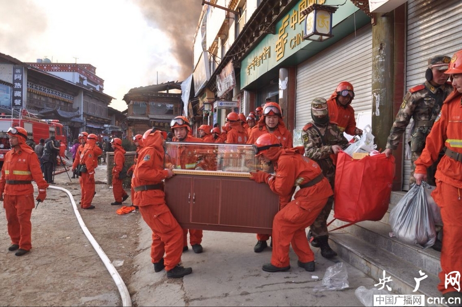 古城大火從一民房引發(fā)后,當(dāng)?shù)販缁鹆α烤o急進(jìn)行了撲救,但由于古城房屋均以木結(jié)構(gòu)建筑為主,大火很快蔓延到古城大部分房屋,并直接威脅緊鄰古城的重點(diǎn)景區(qū)大佛寺的安全。為阻止大火燒毀古寺,迪慶森林大隊(duì)積極請(qǐng)領(lǐng)任務(wù),擔(dān)負(fù)保護(hù)大佛寺安全的任務(wù)。他們迅速阻止官兵清除古寺周邊建筑木質(zhì)可燃物,降低大火蔓延強(qiáng)度,并古城外圍架設(shè)森林消防水泵,向大佛寺遠(yuǎn)距離輸水撲打蔓延到古寺周邊的大火。同時(shí),積極抽調(diào)官兵轉(zhuǎn)移少數(shù)民族受災(zāi)群眾,幫助他們搶運(yùn)屋內(nèi)物資,提供簡單醫(yī)療服務(wù)。