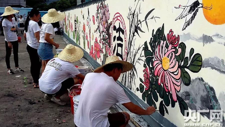 走進(jìn)四會(huì)市羅源鎮(zhèn)文化廣場,淡雅的潑墨荷花、鮮艷的工筆紅梅、端正的廉潔書法映入眼簾,300多平方米的墻繪滿是廉政元素。而在4個(gè)月前,這堵圍墻上還空無一物。今年7月,該鎮(zhèn)聯(lián)合肇慶學(xué)院美術(shù)學(xué)院利用閑置的文化廣場,設(shè)計(jì)、繪制了這幅巨型廉政墻繪。