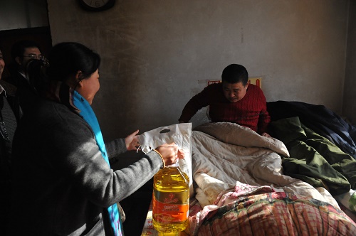 緊接著,愛心人士又馬不停蹄地來到膠西鎮(zhèn)最偏遠(yuǎn)的一個村——孝源店子村,來這里探望十多戶生活困難家庭。貧困戶王清丈夫去世不久,她一個人拉扯著兩個孩子,還要照顧智障的大哥,讓在場的愛心人士深受感動。除送來的生活物品,青島君慈靈蘊心理咨詢有限公司負(fù)責(zé)人姚麗君當(dāng)場掏出600元,塞到王青手里。另一位家庭生活困難的村民黃永剛,因一場車禍胳膊致殘失去了勞動能力,至今仍躺在床上,本來富裕的家庭現(xiàn)在“因病返貧”。愛心人士也給他送來了家庭急需的生活物品和愛心款。